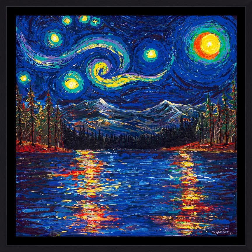 Lake Tahoe is a magical place of light and color set in nature’s awesome landscape. In my newest mix media creation The Magic of Lake Tahoe I channel my love for Van Gogh with the beauty of this iconic view. The starry night sky adds to the amazing spirit and creates the mood of this already breathtaking setting. This beautiful piece will be available as a limited edition giclee on canvas available exclusively at Wyland Galleries and wylandgalleries.com